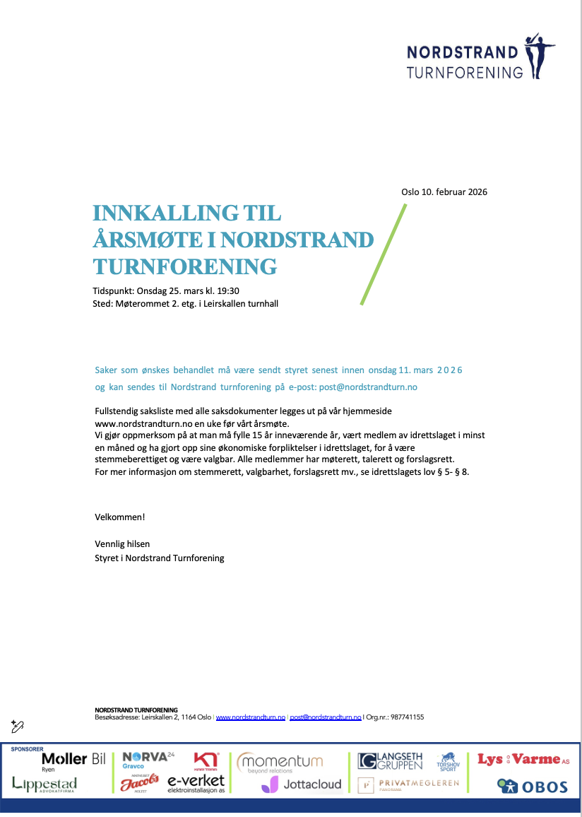 Saker som ønskes behandlet må være sendt styret senest innen onsdag 11. mars 2026 og kan sendes til Nordstrand turnforening på e-post: post@nordstrandturn.no