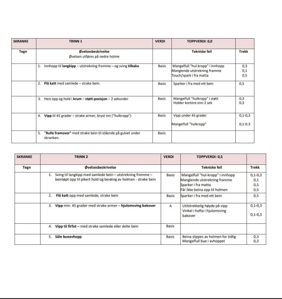 Gjeldene bestemmelser: · Det er mulig å bytte /erstatte et element ved behov. · Utøver kan bli holdt (får noe trekk for dette). · Utøver kan legge til et ekstra element til slutt i programmet sitt. Dette gjelder i frittstående og skranke. I skranke kan det f.eks. være engelskmann, en vipp til firfot eller såle. · Det er valgfritt opp-hopp og avhopp i bom.
